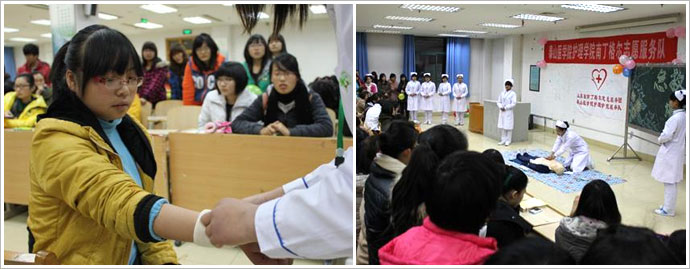 为了普及最先进、最实用的急救技术,提高我校学生的创伤自救能力,我院南丁格尔志愿服务队于11月19日晚,在图书信息楼1-01开展了普及急救技术活动,外国语学院和公共卫生学院的学生共计200人参加了培训。