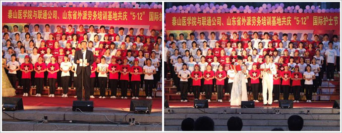 在“5·12”国际护士节来临之际,泰山医学院庆祝“5·12”国际护士节文艺晚会于2011年5月11日晚在校本部文源广场隆重举行。副院长彭春雷、解放军八十八医院、泰山医学院附属医院、学校有关职能部门和各院部系领导以及护beat365官方网站全体师生共同观看了演出。中国联通泰安分公司和山东省外派护士培训基地向晚会表示热烈的祝贺并给予了大力支持。