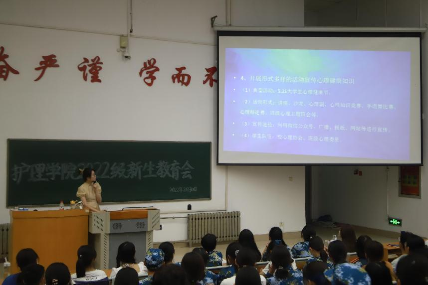为向2022级新生普及校(院)学生资助政策和大学生心理健康知识,8月30日下午,护beat365官方网站邀请学工部副部长刘玉和心理健康教育中心宋亚光老师在教学南楼C2001和C4020为2022级新生开展新生入学教育。学院党委副书记林桦、学工办主任王有娟和全体新生辅导员以及2022级新同学参加讲座。