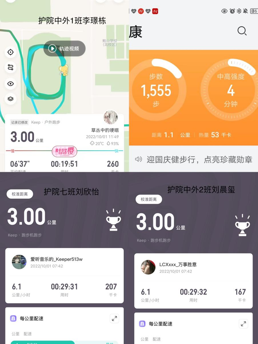 本次活动面向学院全体学子,尤其是因疫情原因不能回家的留校同学,同时假期返家同学也可在家完成打卡活动。同学们用青春的奔跑为祖国七十三年华诞庆生。活动通知发布后,同学们踊跃报名积极参与,邀请自己的同学、家人、朋友与自己一起完成10.1公里的悦跑活动,并拍照上传留念。青春的色彩并未因霡霂落雨而失去活力,护理学子在活动中始终怀揣昂扬热情,努力奔跑,充分展现了护理学子积极向上、自强不息的精神风貌。
