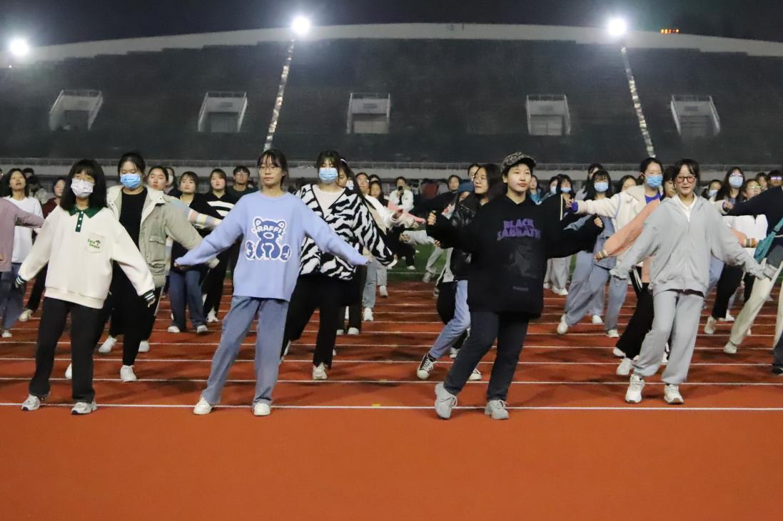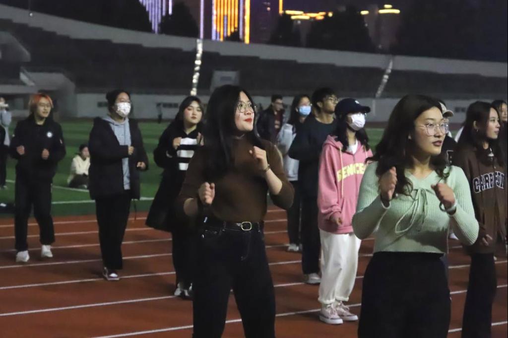 同学们集合完毕后,首先由领舞同学进行动作示范,大家合着节拍,跟随台上同学学习分解动作。欢快愉悦的开场舞《我们都是追梦人》上来就点燃了现场的气氛。随后,一首经典的《最炫民族风》再次激起大家的热情。短暂的休息过后,在《日不落》的浪漫中,大家再次跟随台上同学的节奏激情舞动。汗水与笑容融合,灯光与月光交汇,师生们与音乐共舞。动感的节奏、熟悉的旋律,体育场上洋溢着热烈欢快的青春气息。