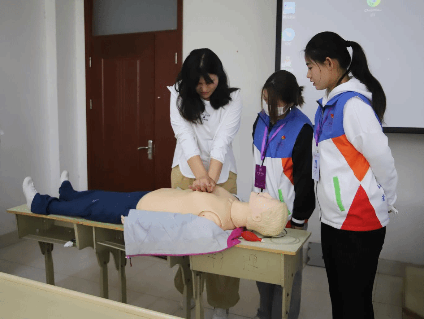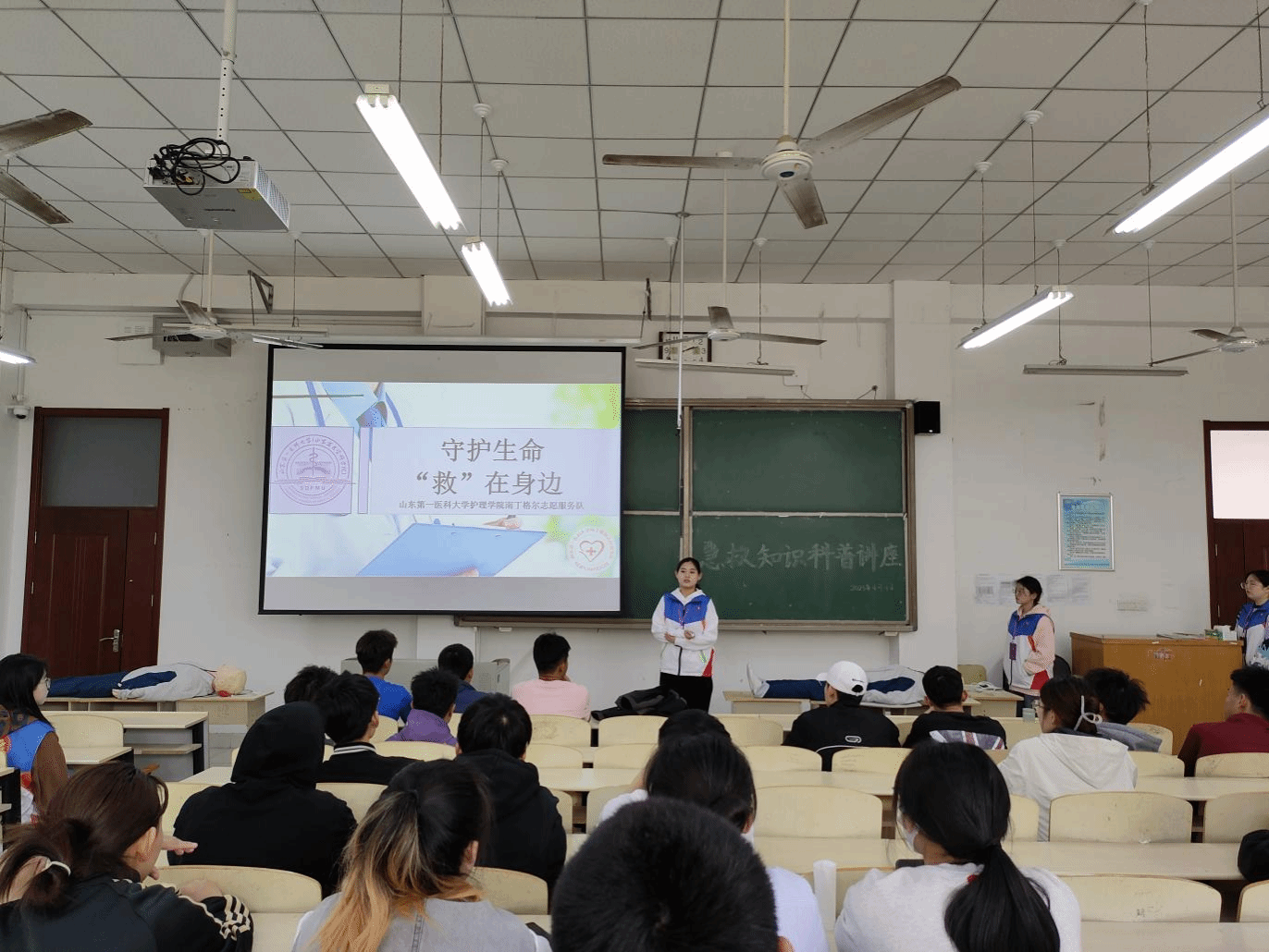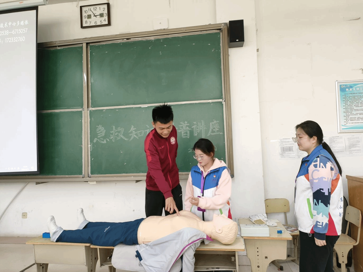 活动伊始,晁毓菡代表泰山学院向服务队表示诚挚欢迎。活动中,队员们运用医学专业知识,围绕心肺复苏要领、AED功能和使用方法等方面,以急救前、急救中和急救后三个阶段的准备工作、具体操作和注意事项作为讲解的重点,采用ppt讲解和现场模拟演示相结合的方法,对心肺复苏以及如何使用AED进行了生动的演绎。