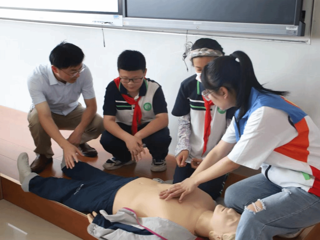 急救技术普及环节将活动推向高潮。团队以实用的心肺复苏技术为例,通过理论知识讲解、急救技能演示、实际操作等形式进行讲解,全面演示了心肺复苏的操作全过程。随后,林桦带领场下学生进行心肺复苏操作,鼓励同学们大胆尝试,踊跃参与。学生在操作过程中,队员在旁为其纠正动作,并进行动作规范性讲解,现场氛围浓烈。