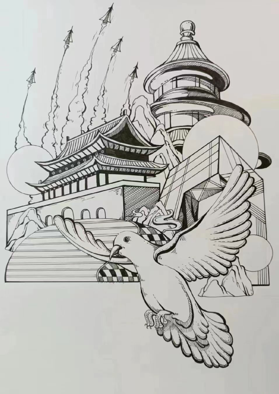 以丹青入墨,绘盛世华夏。天安门后,震撼人心的空中阅兵彰显强大的国防实力。天安门前,和平鸽飞过,国泰民安。