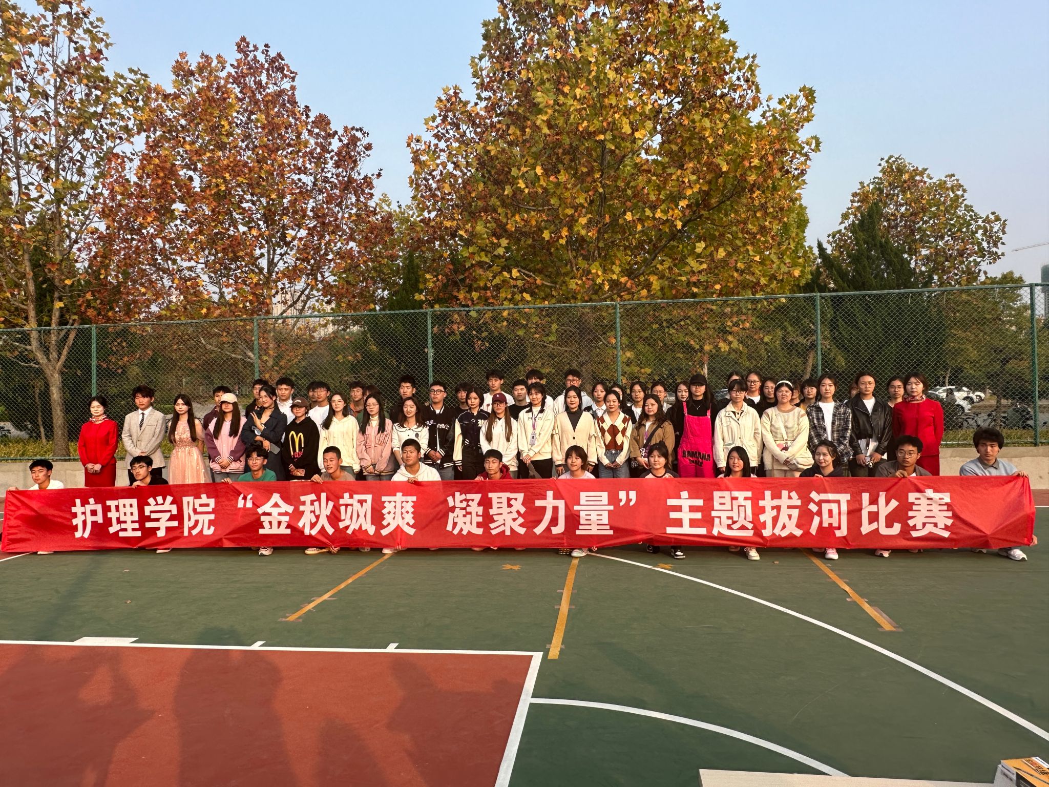 为增强学生的团结意识和团队精神,提高团队凝聚力,鼓励大学生强健体魄,培养学生坚韧不拔的意志,形成和谐、文明的校园氛围,10月29日下午,护beat365官方网站于新体篮球场举办“金秋飒爽,凝聚力量”主题拔河比赛。