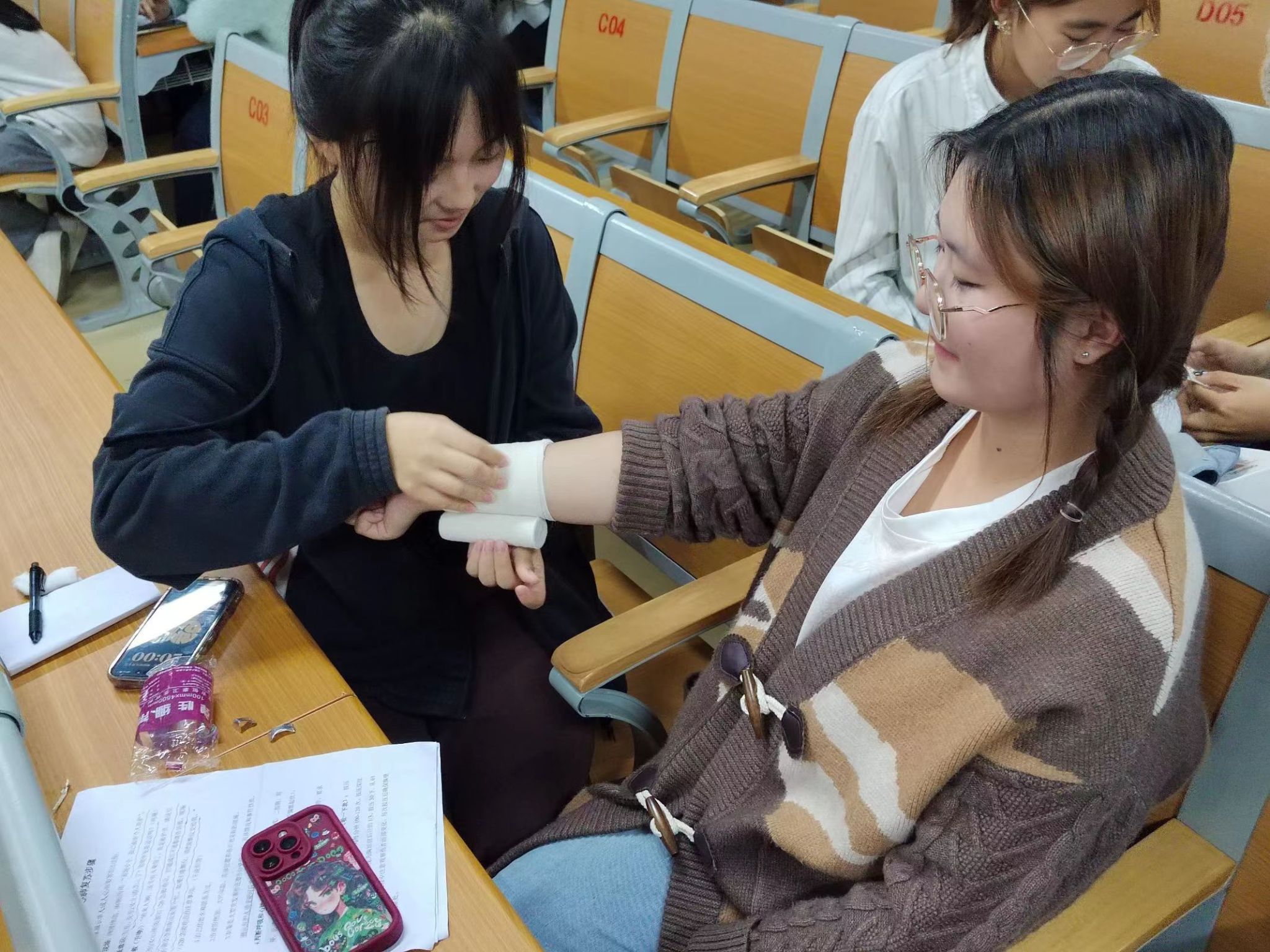 训练内容主要包括血糖仪和血压计的使用方法、各种医疗包扎的操作技巧以及心肺复苏急救技能的练习。根据具体训练安排,新队员从最基础的血糖仪和血压计的使用方法开始学习。队员们经过系统学习后,已经熟记各仪器的操作要点,两两一组进行实操练习,通过组内互相指正,加深记忆。在医疗包扎技巧的学习阶段,队员们了解并记忆了八字包扎、环形包扎等常用包扎方法的操作技巧及对应的使用部位,结合队长的操作演示,队员们反复练习,以便早日熟练完成包扎的各项步骤。面对较为复杂的心肺复苏术,各中队利用假人进行心肺复苏的模拟实训,中队长生动讲解并展示了环境评估、判断意识、有无自主呼吸和脉搏、胸外心脏按压、清理呼吸道、开放气道、人工呼吸等步骤,为队员们进行一对一的指导,确保队员操作的专业性。