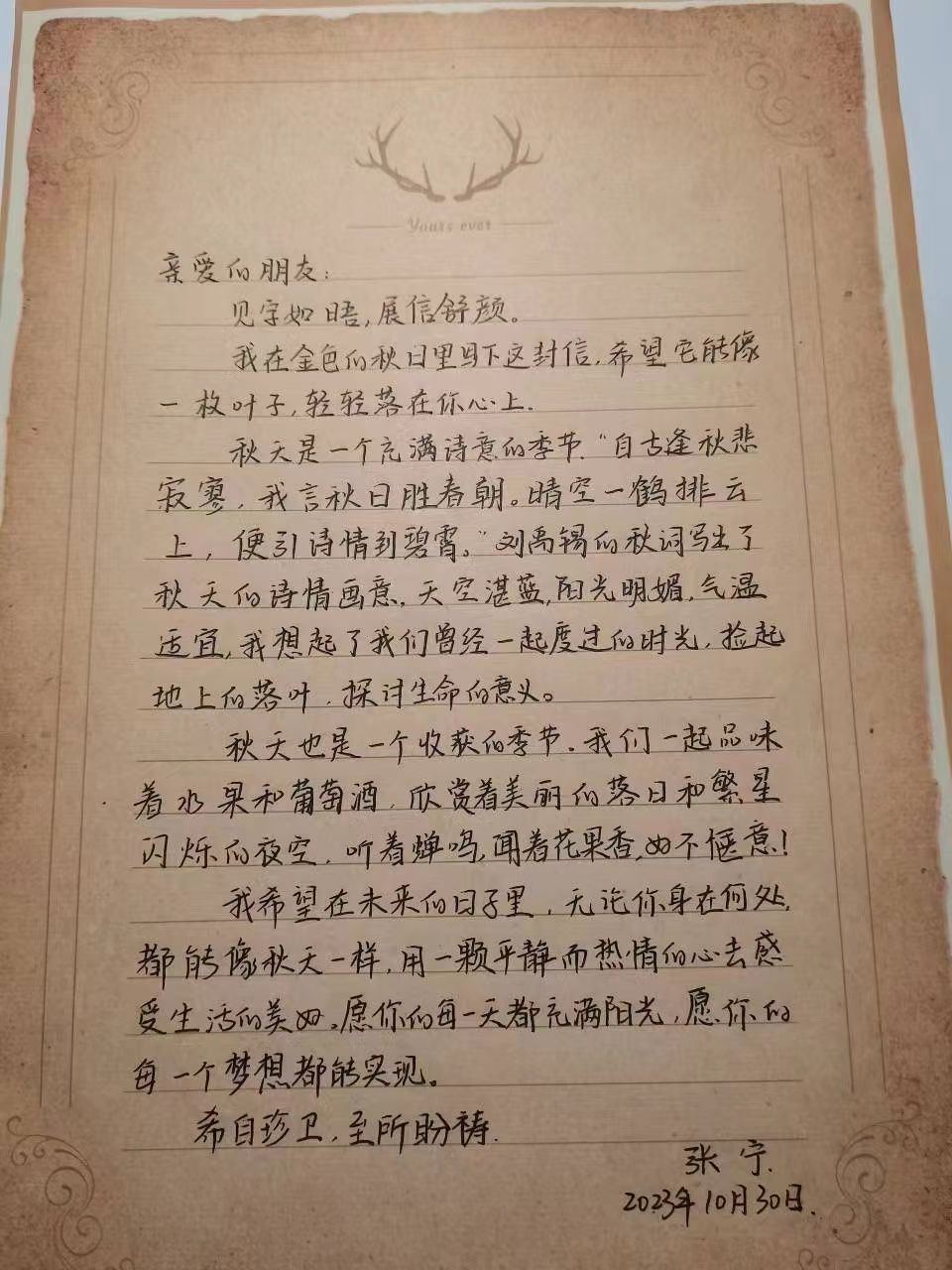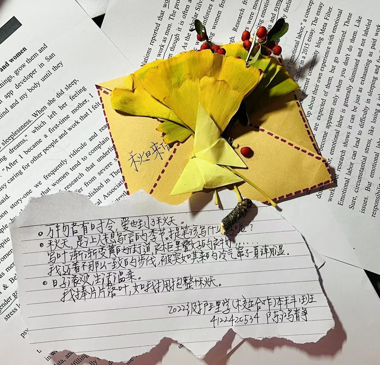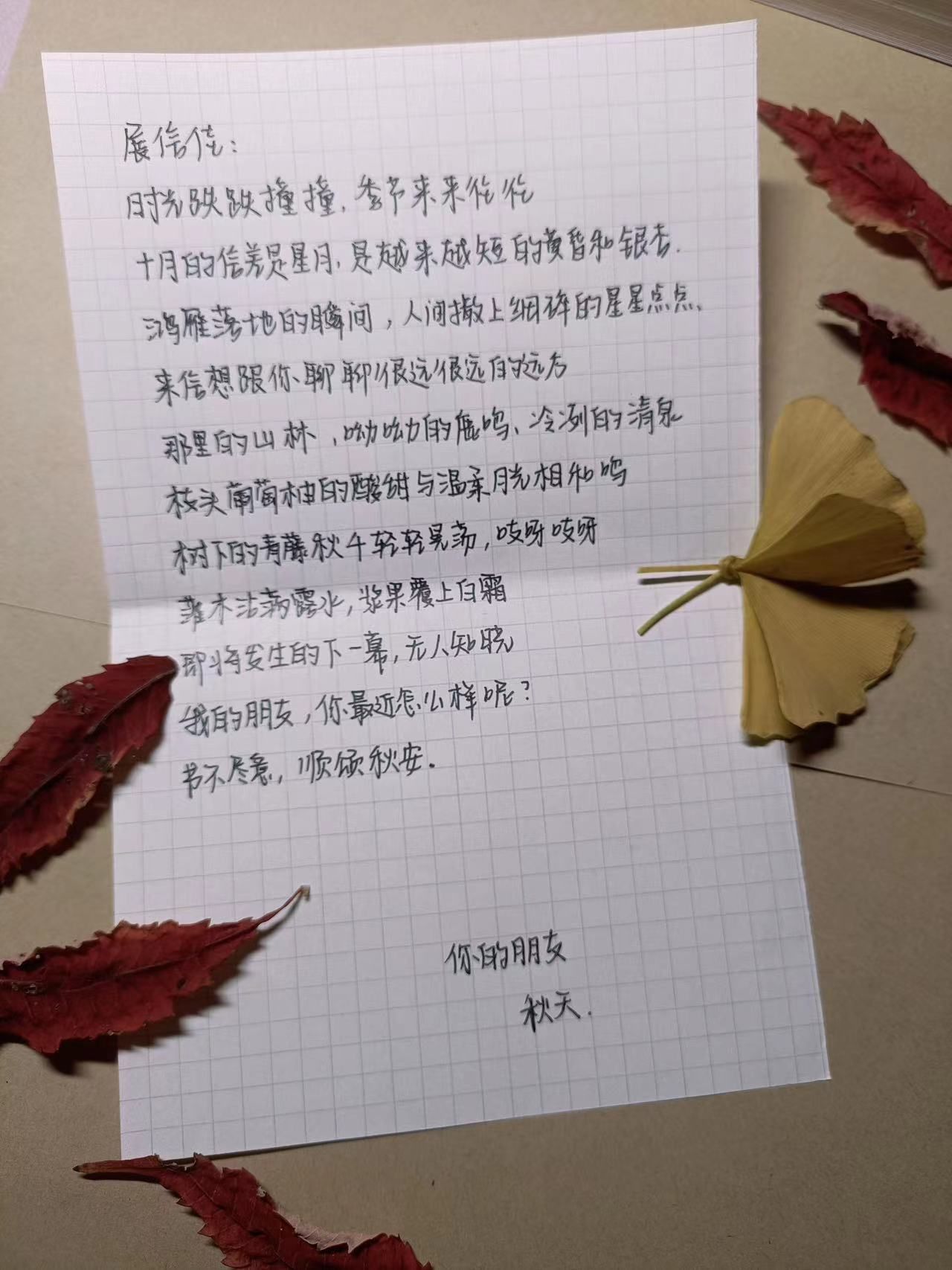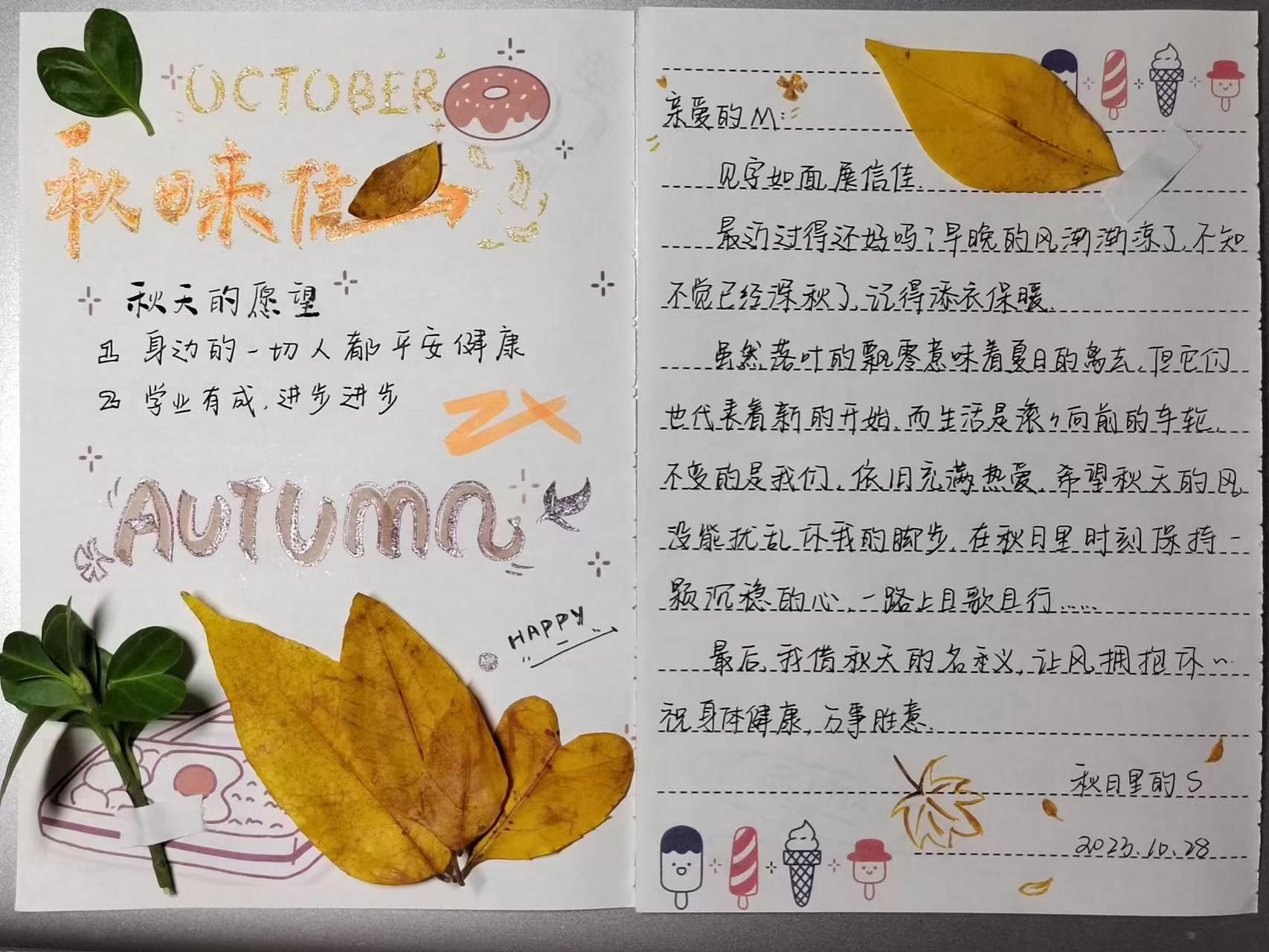 为鼓励同学们走进秋日校园,领略大自然的独特魅力,营造热爱自然和保护自然的良好氛围,近日我院举办“秋日来信,美好相约”写信征集活动。本次活动面向护beat365官方网站全体学生。