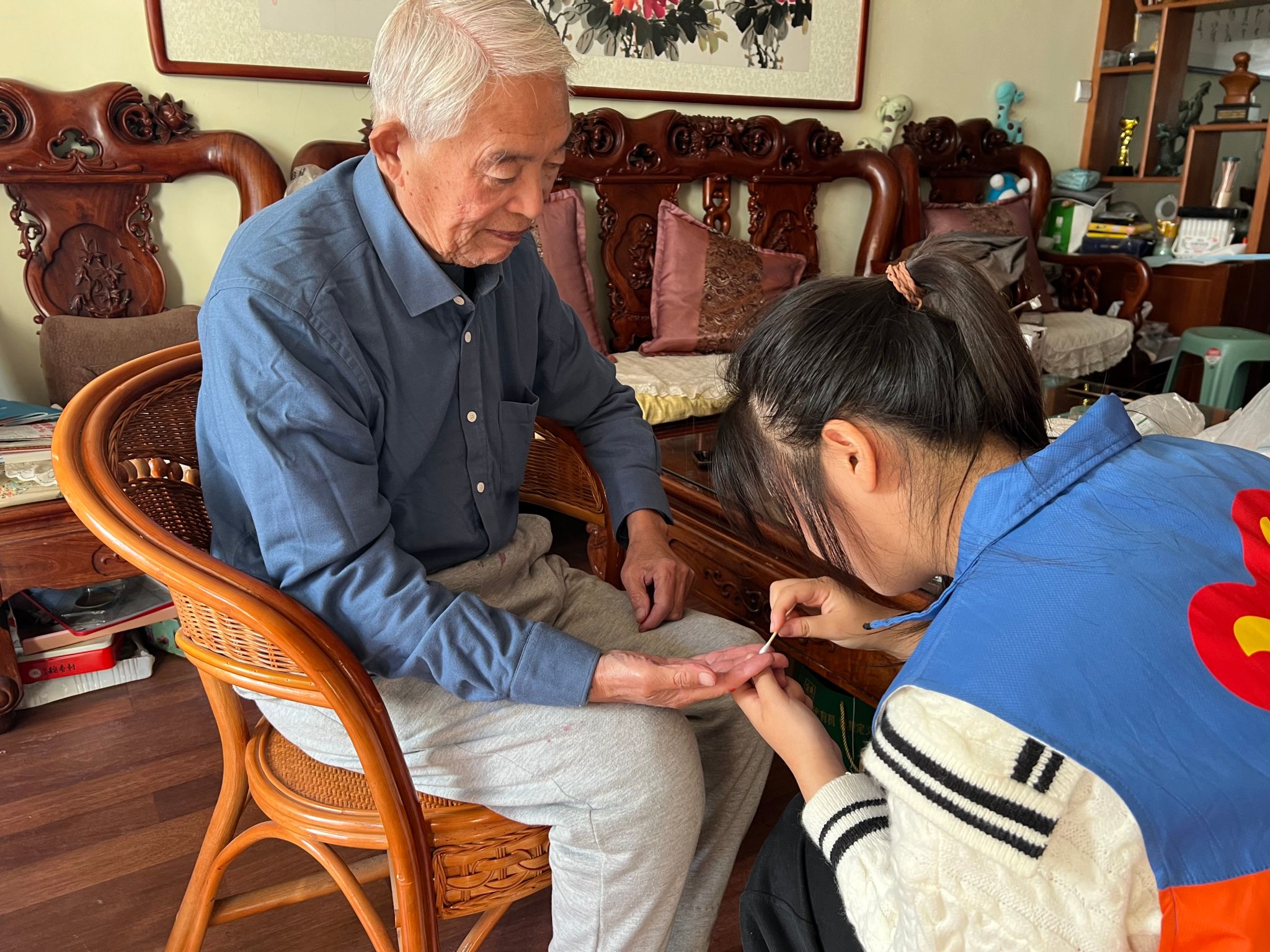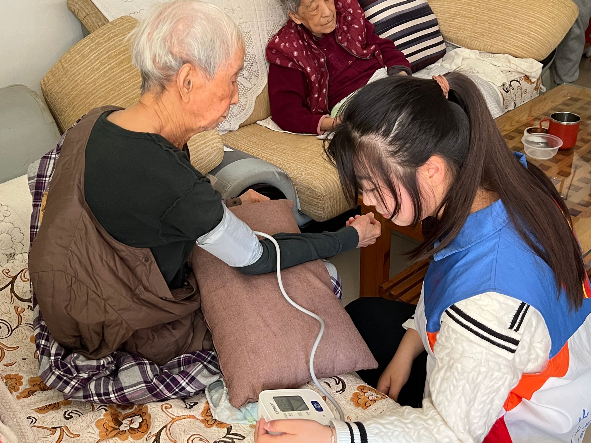 活动当天,队员们分为两队,跟随社区志愿工作者前往社区老人家中,为他们及其子女开展志愿服务活动。一队队员为老人们测量血压、检测血糖,根据测量结果仔细分析老人们的身体健康状况,并耐心地给社区老人及其子女科普有效控制血压血糖的健康生活知识,特意强调要让老人们多参加手指操、广场舞等体育锻炼。另一队队员则为老人们及其子女普及了心脑血管病、糖尿病、精神异常等几种常见老年病的预防知识,细心嘱咐老人们要保持积极乐观的心态并做到定期体检,以尽量避免此类慢性病的发生。队员们热情负责的服务态度赢得了老人们的赞许。