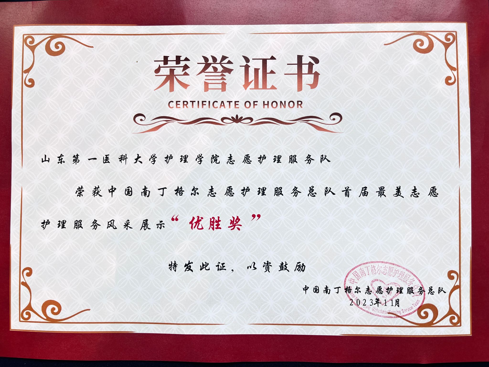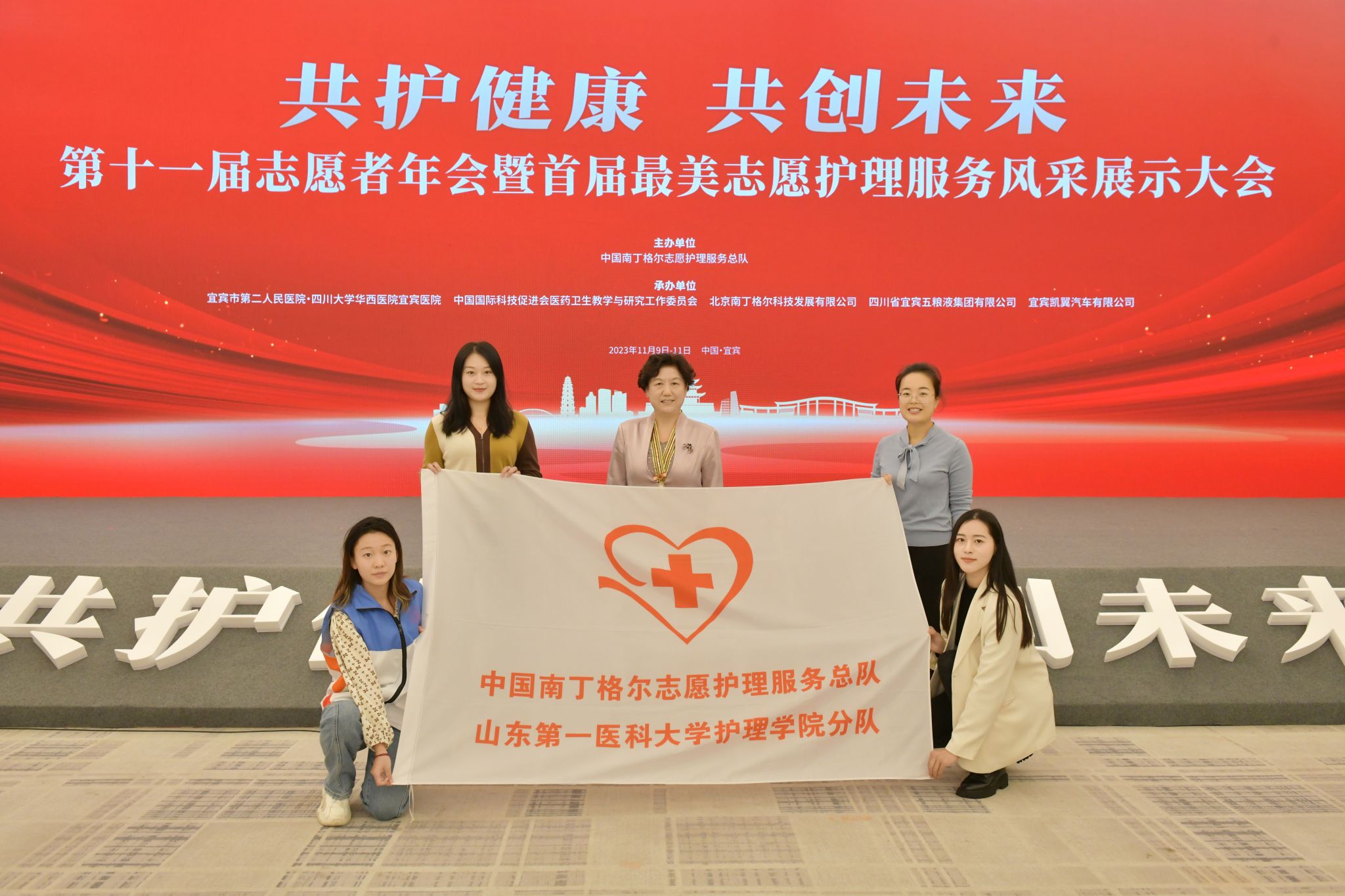 2023年11月9日至11日,中国南丁格尔志愿护理服务总队第十一届志愿者年会暨首届最美志愿护理服务风采展示大会在四川省宜宾市国际会议中心举行。beat365官方网站志愿护理服务队荣获最佳信息管理者奖、最美志愿者奖、最美志愿护理风采展示优胜奖、最美志愿护理风采展示组织奖四项嘉奖。
