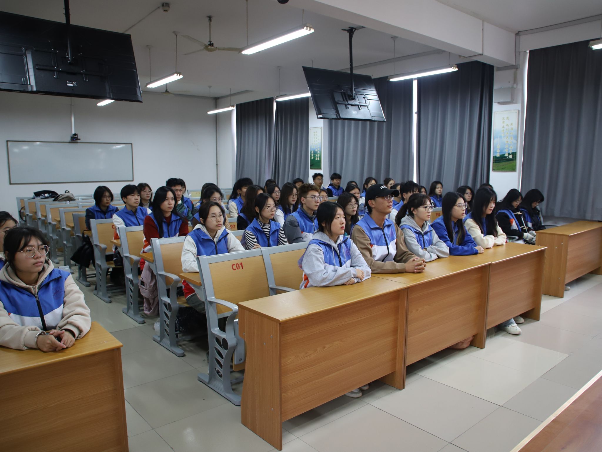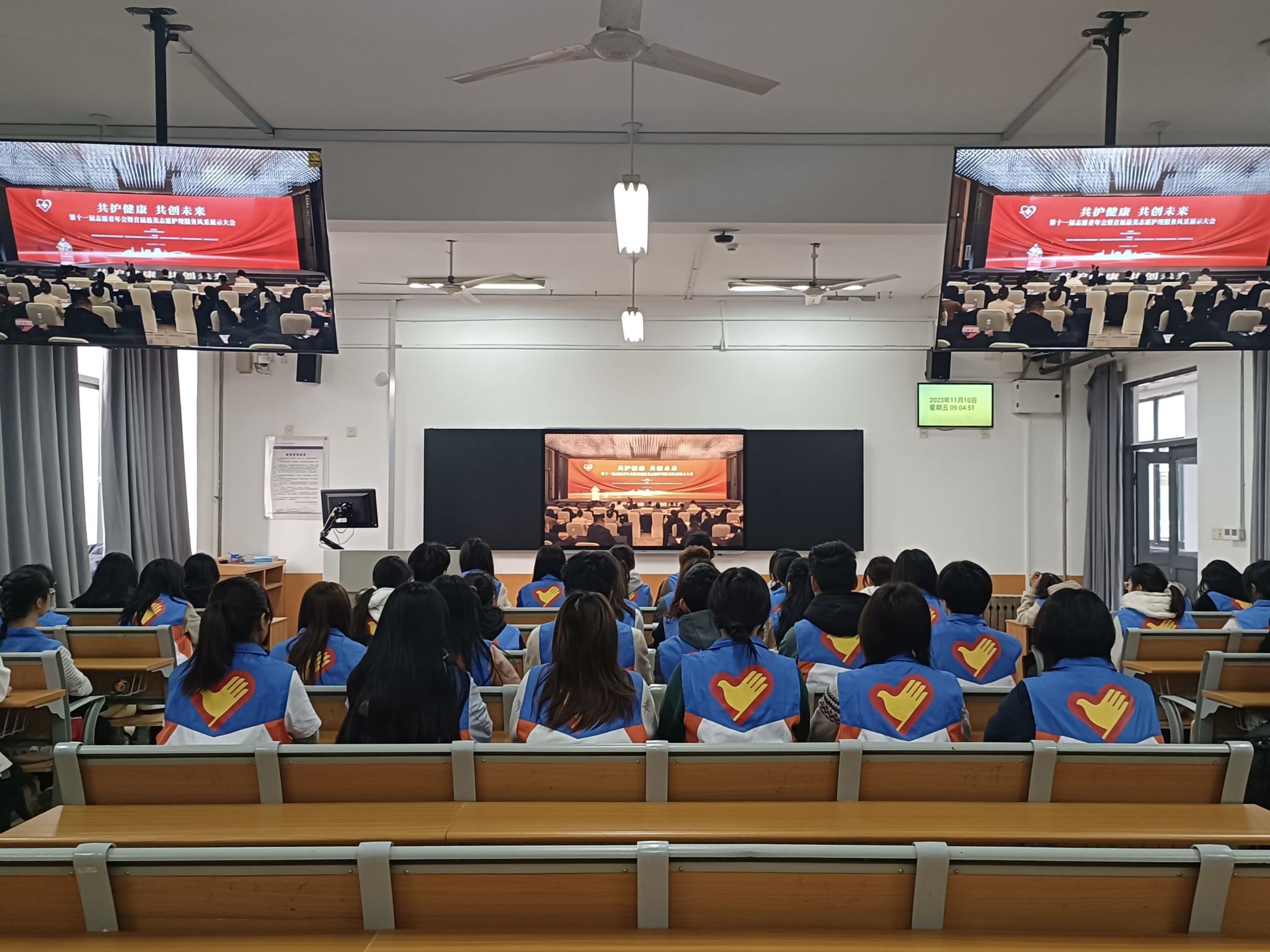 护beat365官方网站团委书记张恒丽、辅导员吴春燕、王雯雯及学院南丁格尔志愿服务队秘书长王玟璇前往四川宜宾参加线下会议,护beat365官方网站南丁格尔志愿服务队队员于教学南楼C3003教室集体观看大会直播。