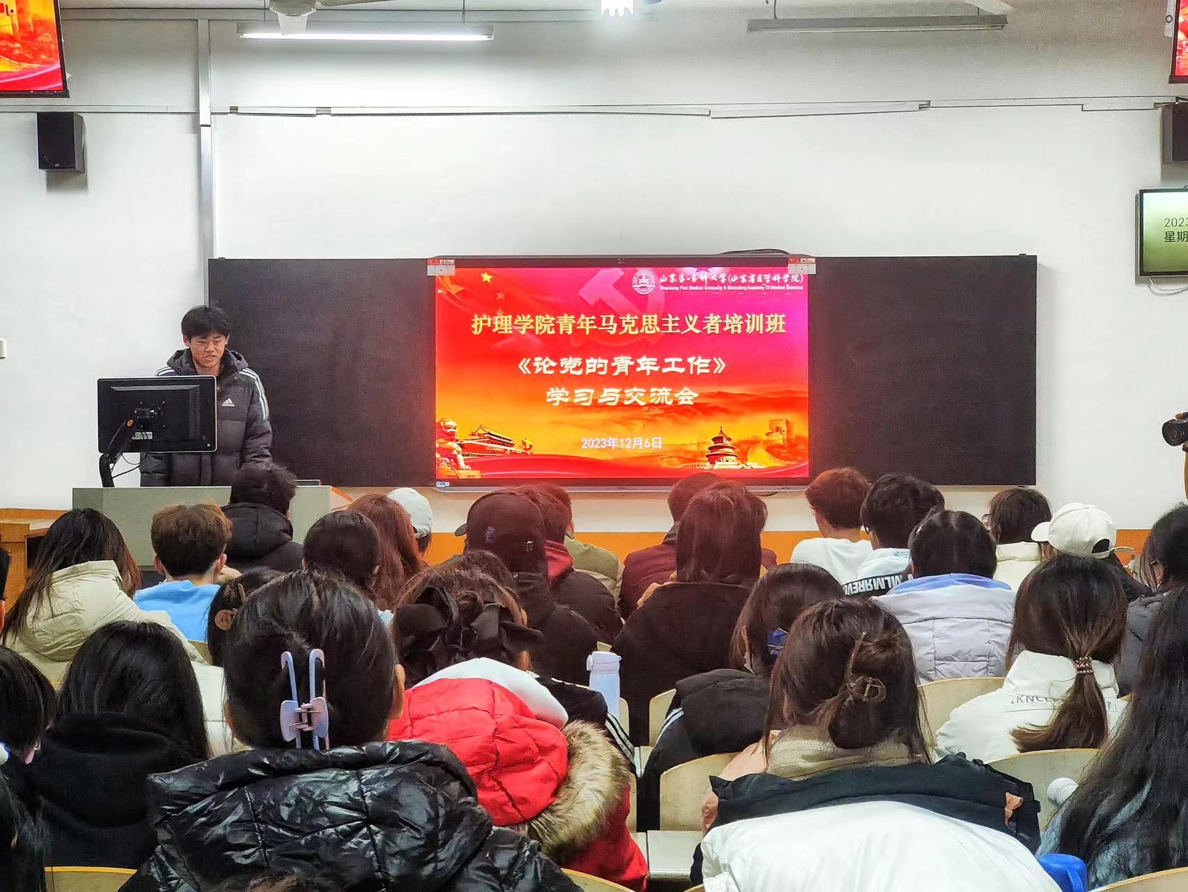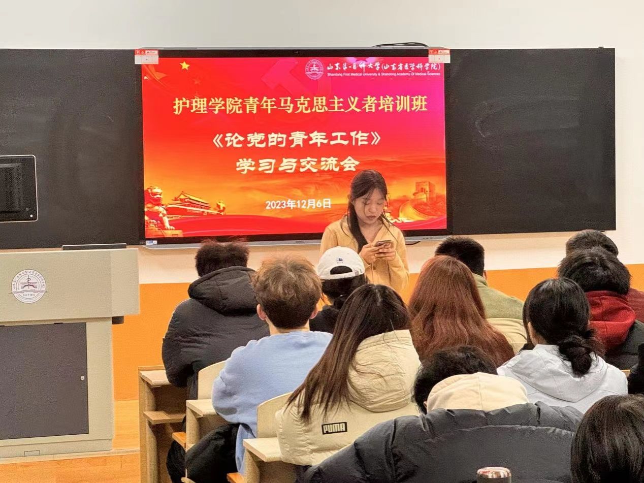 为深入学习贯彻习近平新时代中国特色社会主义思想,帮助广大青年更好地了解习近平总书记对青年工作的重要论述,明确党的青年工作的地位作用、目标任务、职责使命、实践要求,激励广大青年坚定道路自信、理论自信、制度自信、文化自信,12月6日,护beat365官方网站于教学北楼A3014举办青年马克思主义者培训班“读原著、学原文、悟原理”——《论党的青年工作》学习交流会。青马班全体学员参加本次交流会。
