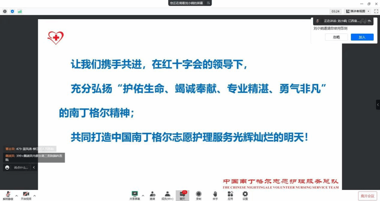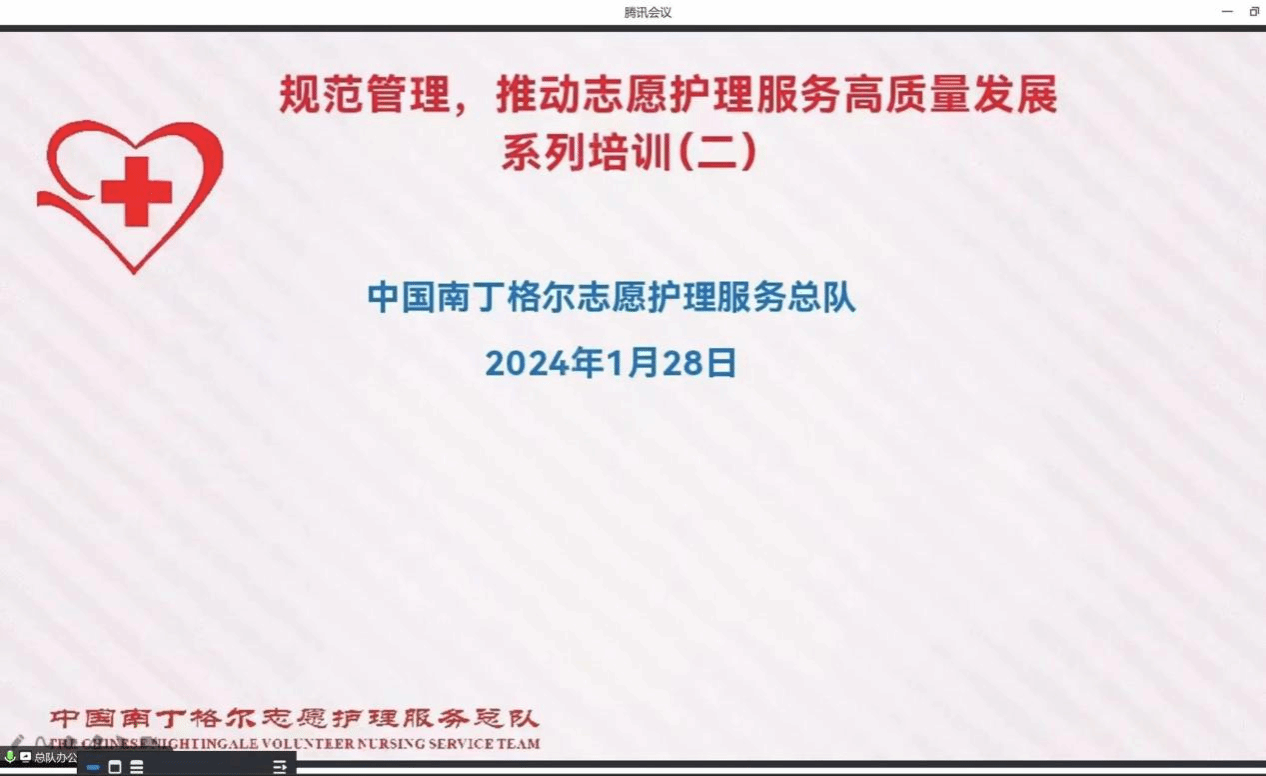 为践行“人道、博爱、奉献”的红十字精神,明确总队整体工作要求和具体工作内容,高质量完成志愿护理服务工作以及信息管理工作,1月28日,中国南丁格尔志愿服务总队于线上进行“规范管理,推动志愿护理服务高质量发展”专项培训。护beat365官方网站南丁格尔志愿服务队全体队员线上观看直播。