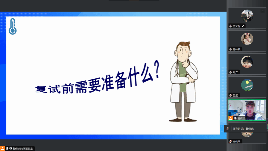 魏保建以自身丰富面试经验为基础,重点讲述了复试前期准备、复试流程、复试注意事项等。首先,他指出要提前了解报考院校的复试要求及流程,从细节下手,做好复试前准备。其次,他对复试中自我介绍、英语口语及专业测试、专业课考核等情况进行了剖析。最后,魏保健提醒同学们在复试中要保持沉着、大方、自信的态度。在提问互动环节,同学们积极提问,讲述自己的困惑,魏保健和王慧为同学们一一解答问题。
