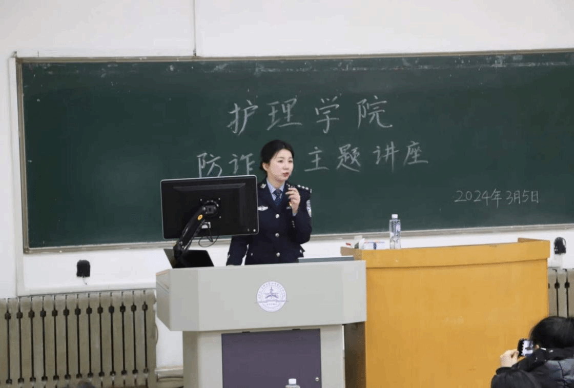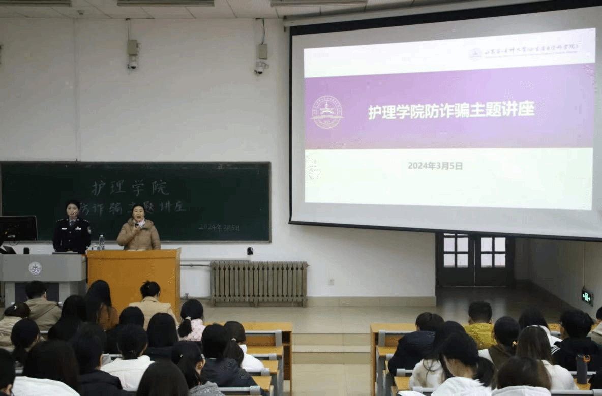 为进一步增强学生防范电信诈骗意识,提高学生在网络时代的自我保护能力,为争创全国文明校园,筑牢安全防线,3月5日下午,护beat365官方网站在教学南楼C1014举办防诈骗主题讲座。此次讲座邀请泰安市高新区凤凰派出所副所长李慧、校(院)安保部治安科科长刘爱庆、赵振鲁以及学院辅导员参加,凤凰派出所崔庆娜警官主讲。