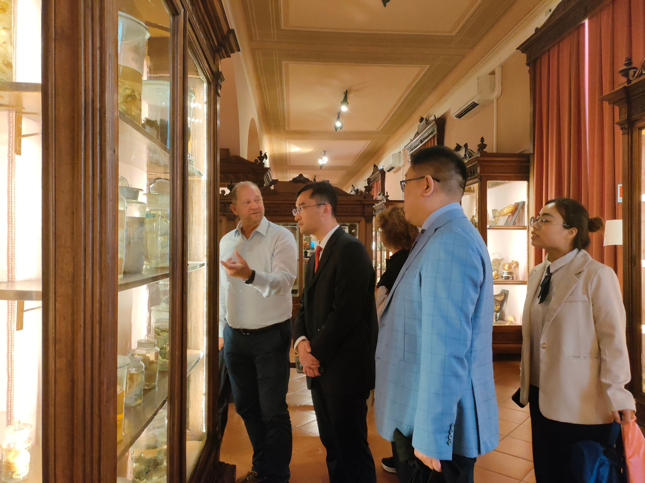 在学校图书馆和标本室内, Sergio Minucci教授带领代表团参观并为大家讲解标本室内的标本。坎帕尼亚大学标本室内存放着许多世界独有的标本,这些标本为学生提供了珍贵的学习资源,帮助他们更好地了解人体结构和生理功能。同时,这些标本也是坎帕尼亚大学解剖学专业的骄傲,代表着他们在医学领域的重要研究成果。