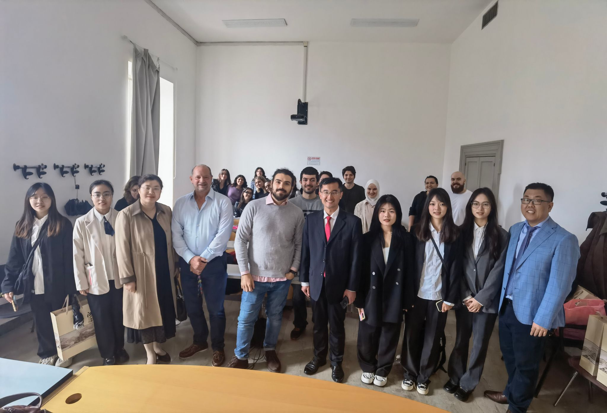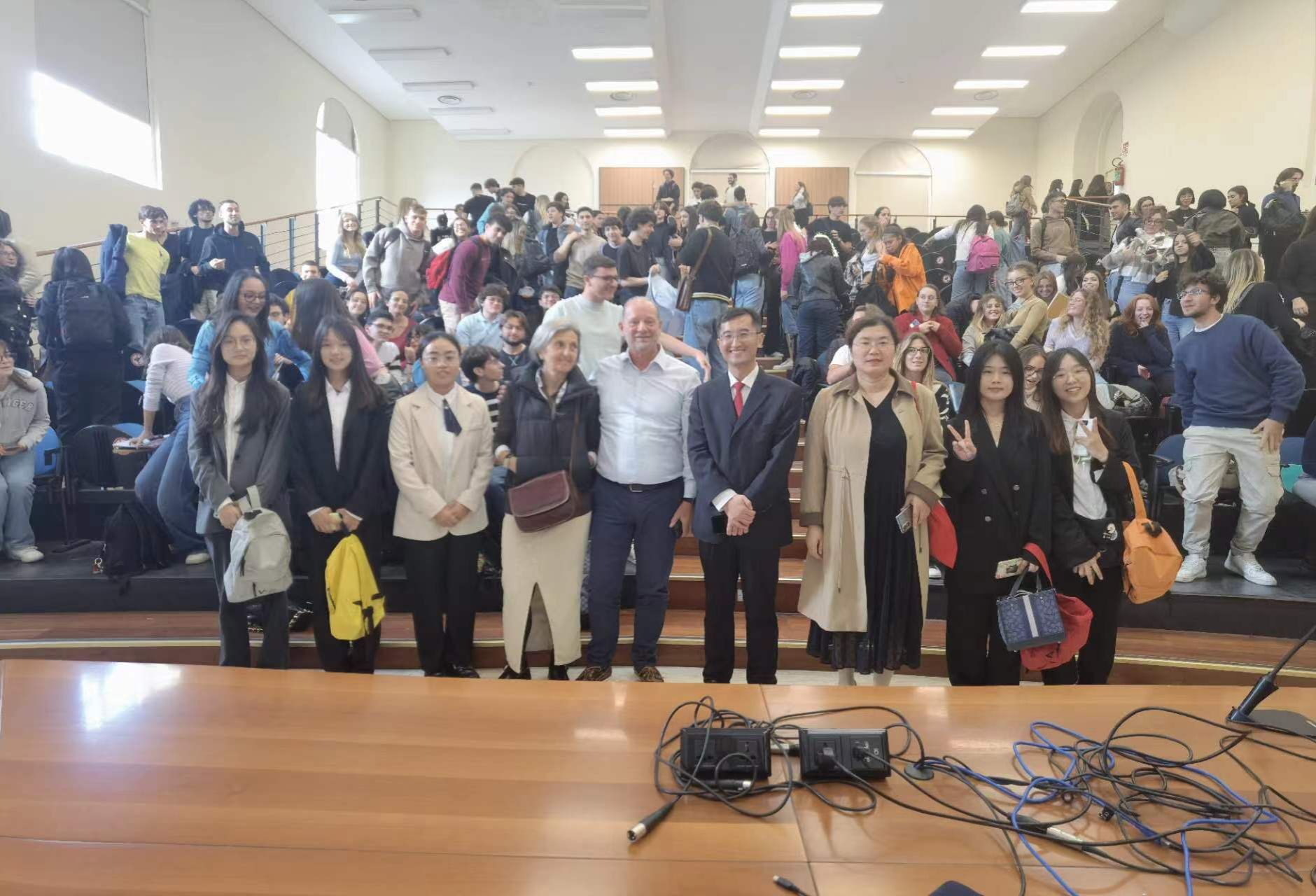 在教室,同学们与国际学生热切交谈并合影留念。