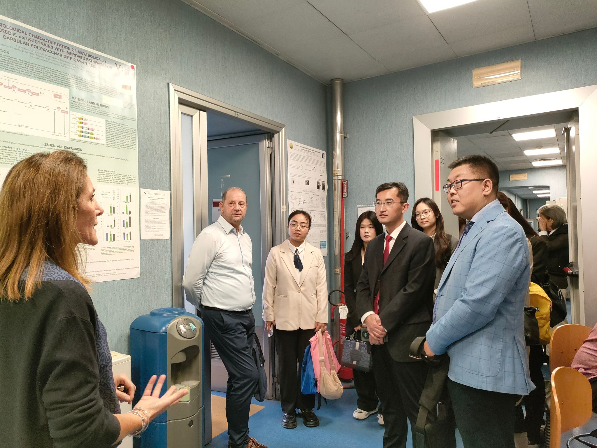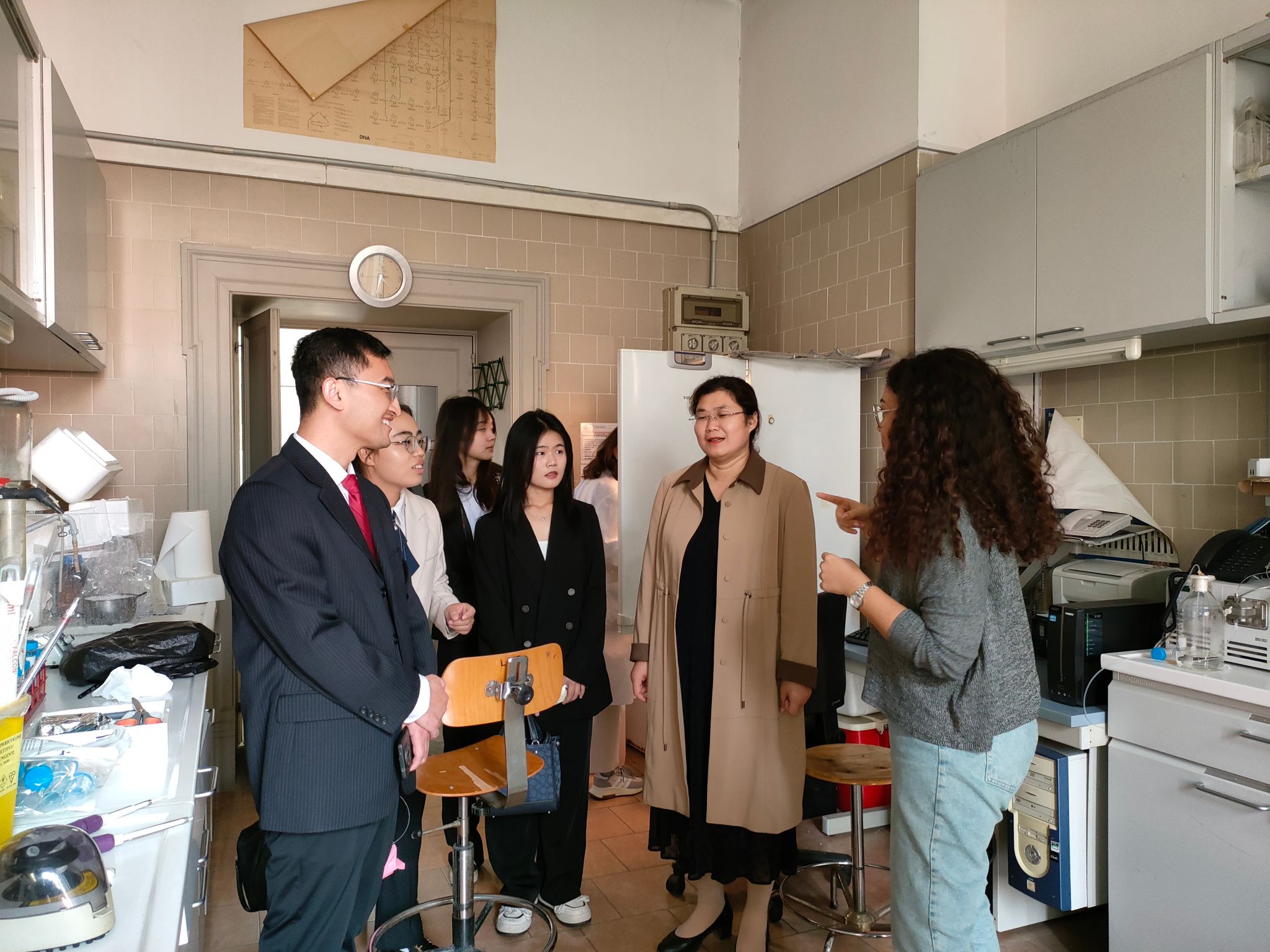随后,Eva Lieto教授带领代表团参观校园及实验室。在博士实验室,来自突尼斯等国家的多名博士为代表团介绍了各自研究领域的方向、方法、研究进展及其相关仪器设备。