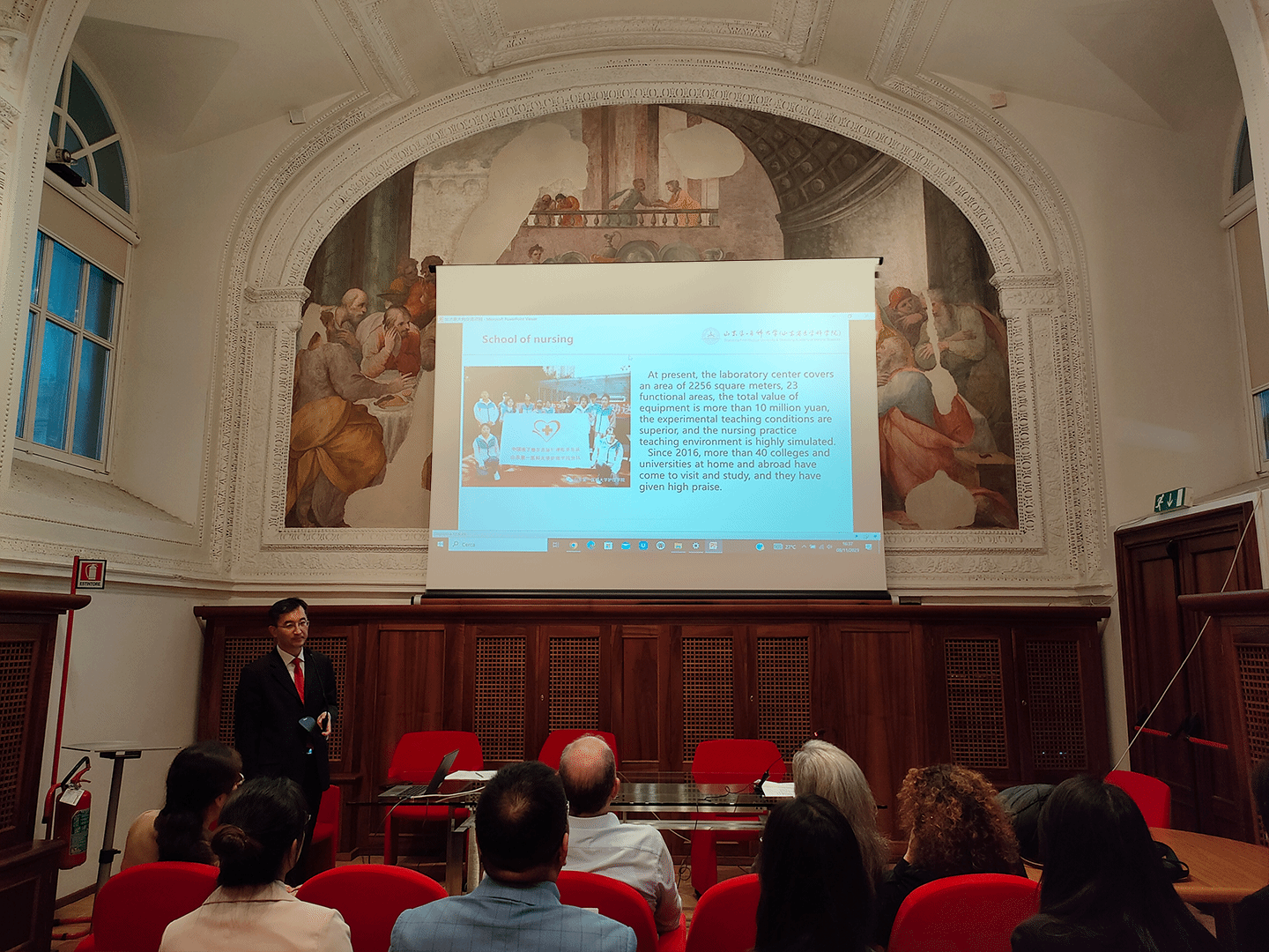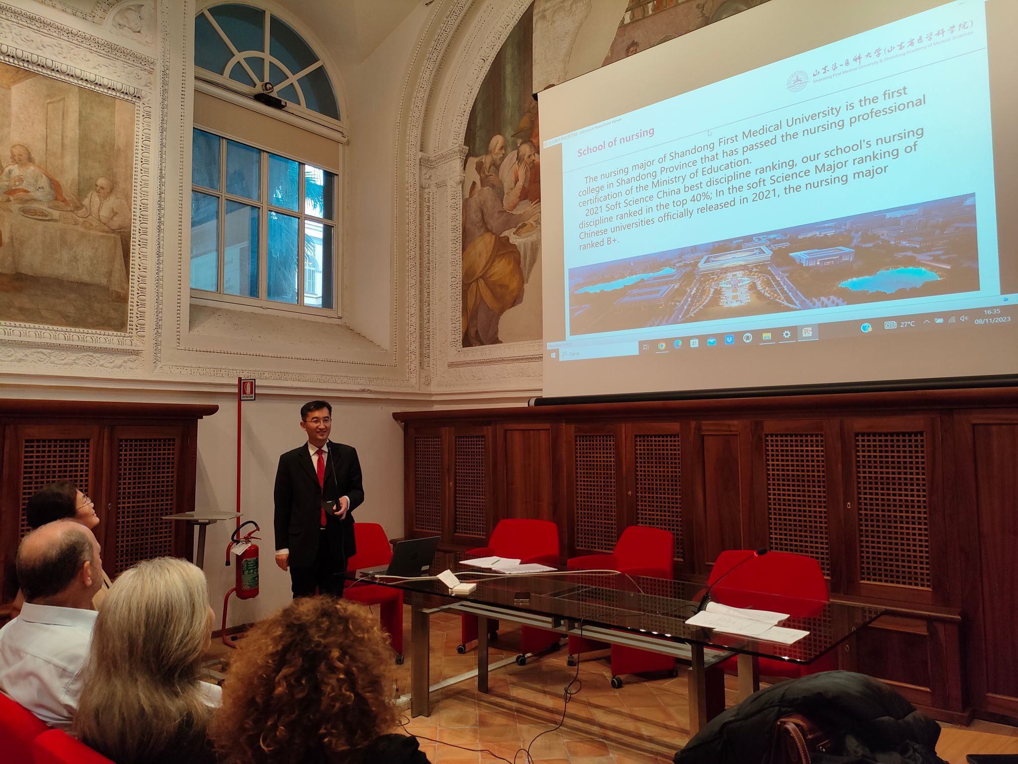 在坎帕尼亚大学医学院大楼,校方举行欢迎仪式。学院代表团与坎帕尼亚大学行政校长Carmela Luise 博士、国际处处长Sergio Minucci教授、护beat365官方网站院长Eva Lieto教授、护beat365官方网站教务主任Ivana Orefice 博士、护beat365官方网站实习工作负责人Laura Bocchet ti博士见面,双方互致问候、亲切交流,并互赠礼物、表达愿景。欢迎仪式结束后,张延玲接受了校方代表的采访。