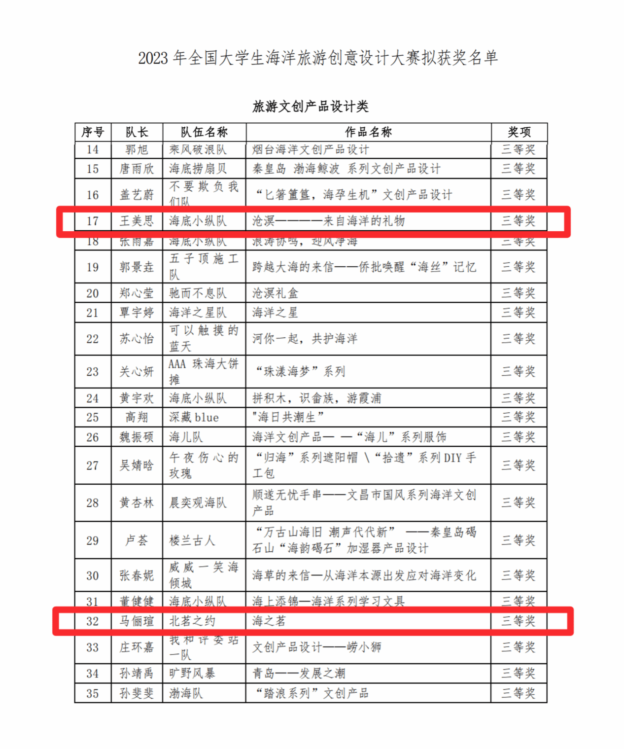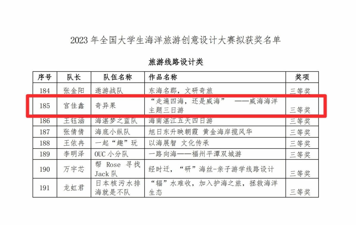 近日,2023全国大学生海洋旅游创意设计大赛拟获奖名单公布,护beat365官方网站学子精心设计的参赛作品在比赛中喜获三等奖3项。
